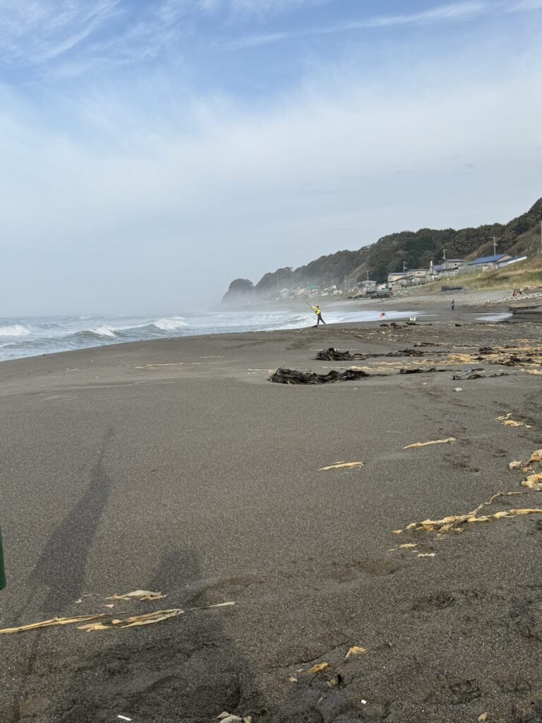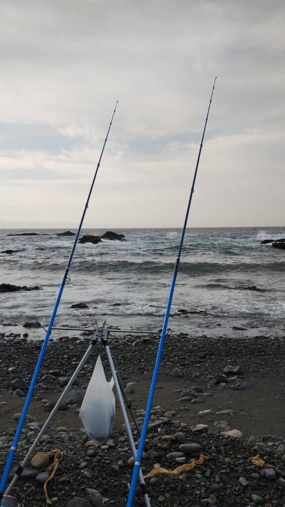 私達が入った釣場。浦河の月寒海岸です。入った夜中はそーでもなかったのですが日が明けてから結構な波とうねり!私の隣に     湯浅ちゃん、その奥に伊藤トシちゃん。3人とも苦労して打ち込んでいますがそこ荒れしていたようでラインがぐちゃぐちゃに      なって上がってきます。上がるころには心折れてやけ酒に変更となりました!